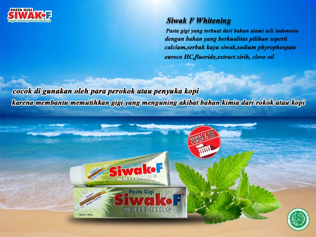 Pasta Gigi Halal Siwak-F Whitening adalah salah satu varian Siwak-F dengan tujuan khusus memutihkan gigi. Dengan kandungan serbuk kayu siwak asli (Salvadora Persica) serta formulasi spesial Fluoride plus Kalsium, Daun Sirih (Piper Betle) dan Minyak Cengkeh (Clove Oil / Eugenia Caryophyllus) untuk merawat dan melindungi kesehatan gigi dan gusi, mengatasi bakteri penyebab penyakit (anti-bakteri), mencegah timbulnya plak, radang gusi dan gigi berlubang.