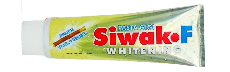 Siwak F Whitening adalah pasta gigi Khusus WHITENING dengan SIWAK plus Fluoride. Perlidungan dan perawatan gigi dan gusi disertai fluoride untuk melawan plak, radang gusi dan gigi berlubang. Juga perawatan gigi agar tampak lebih putih.